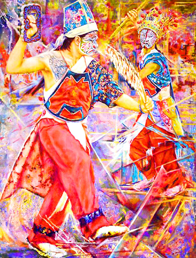 Taiwanese art must beat its own path by exploring native culture and lived experiences to stand out on the global stage of fine arts, said Jhuang Jian-yu (莊洊有), an oil painter whose creations revolve around the ceremonial Dance of the Eight Generals.