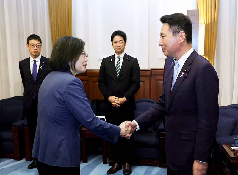 During a meeting at the Presidential Office, Maehara told Tsai that opposition parties in Japan feel strongly about Japan’s relationship with Taiwan and look forward to strengthening it.