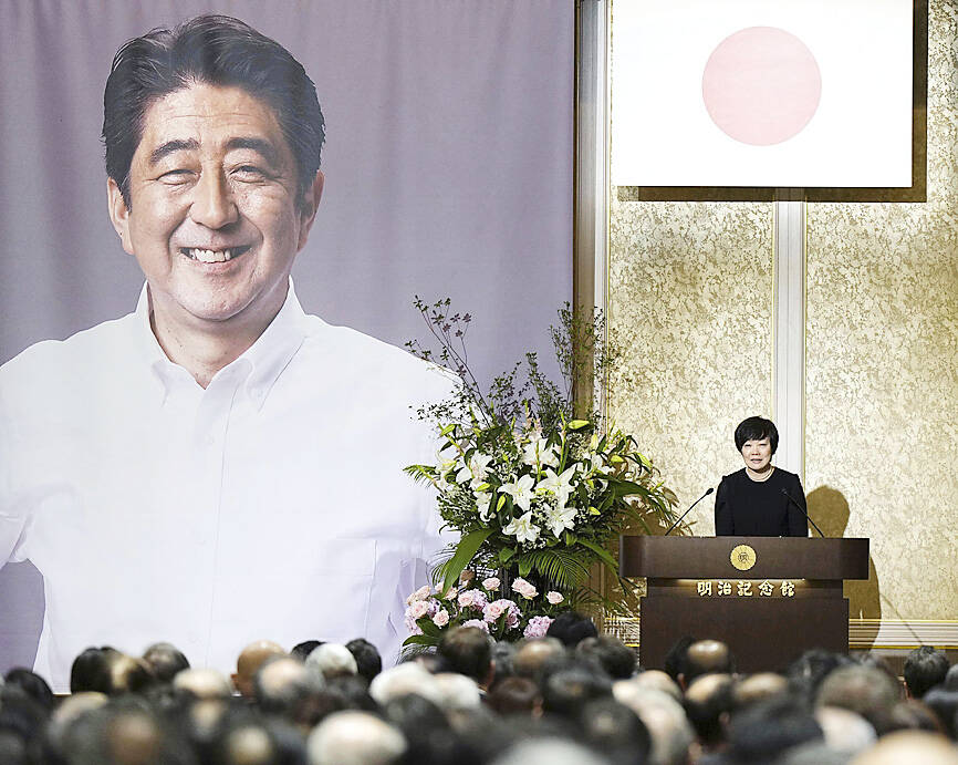 The widow of former Japanese prime minister Shinzo Abe is to visit Taiwan this week to meet with President Tsai Ing-wen (蔡英文) and visit a Kaohsiung temple that houses a life-size bronze statue commemorating her late husband.