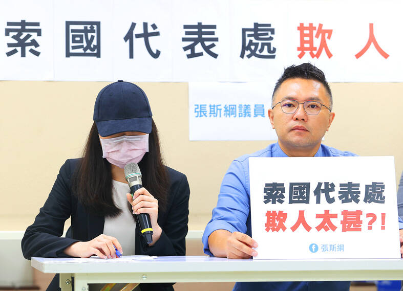 A woman, who used the alias “A”, accompanied by Taipei City Councilor Chang Shi-gang (張斯綱), held a press conference yesterday in Taipei.