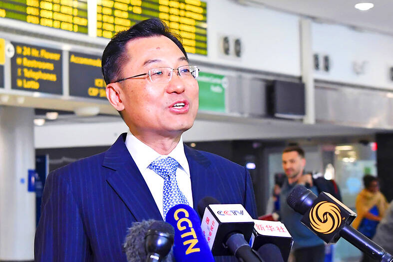 It is China’s “priority” to stop Vice President William Lai (賴清德), the Democratic Progressive Party’s (DPP) presidential candidate, from visiting the US next month, China’s ambassador in Washington said on Wednesday, as Beijing steps up its warnings against the trip.