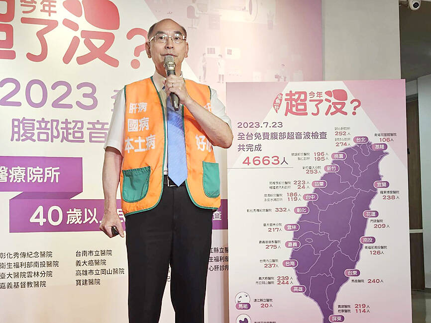 A total of 4,663 people received the abdominal ultrasound test, and 3,795 people among them had abnormalities, accounting for 81.4 percent of all test recipients, foundation chief executive officer Yang Pei-ming (楊培銘) said.