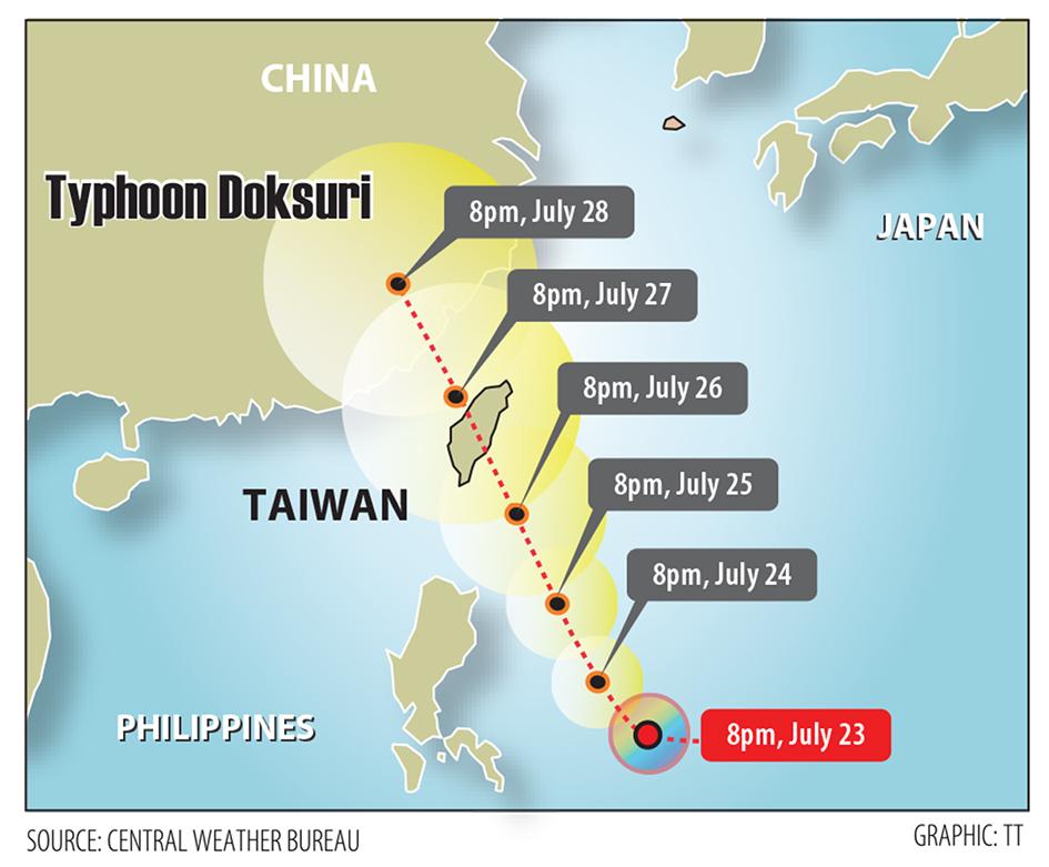 As of 2pm yesterday, Doksuri was 1,130km southeast of Oluanpi (鵝鑾鼻), Taiwan’s southernmost point, and was moving west at 12kph, the bureau said.