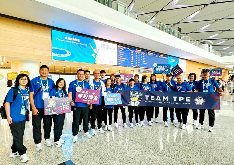 Sports Administration Director-General Cheng Shih-chung, fourth left, welcomes the first batch of Taiwanese athletes at an airport in Chengdu, China, yesterday. The athletes are to take part in the World University Games, scheduled to begin next month in the Chinese city.