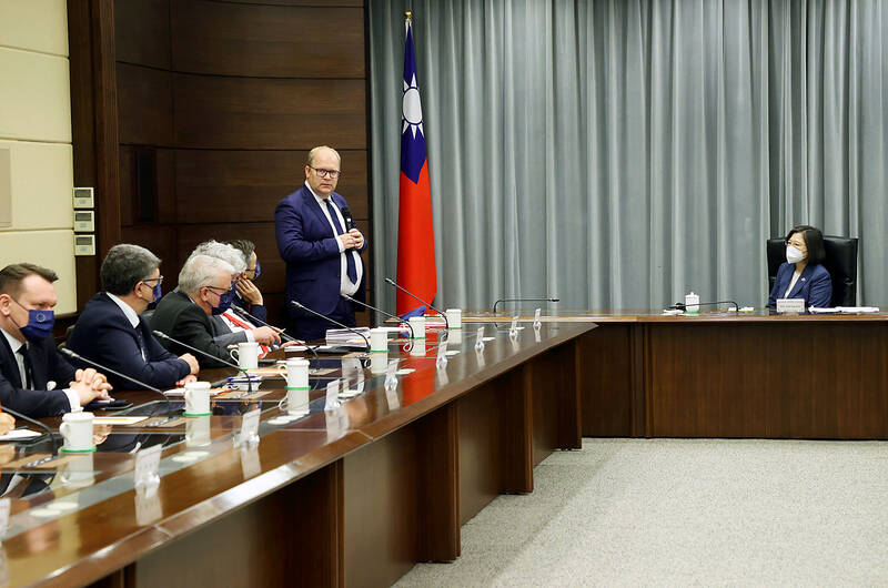 President Tsai Ing-wen (蔡英文) touted the need for a bilateral investment agreement (BIA) between Taiwan and the European Union during a meeting with members of a European Parliament delegation yesterday in Taipei.