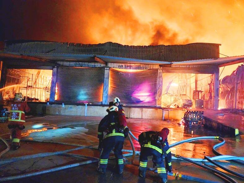 The New Taipei City Fire Department said the fire was reported at 7:32pm, and when firefighters arrived at the warehouse in Linkou District (林口), it had already been engulfed in flames that were visible from several kilometers away.