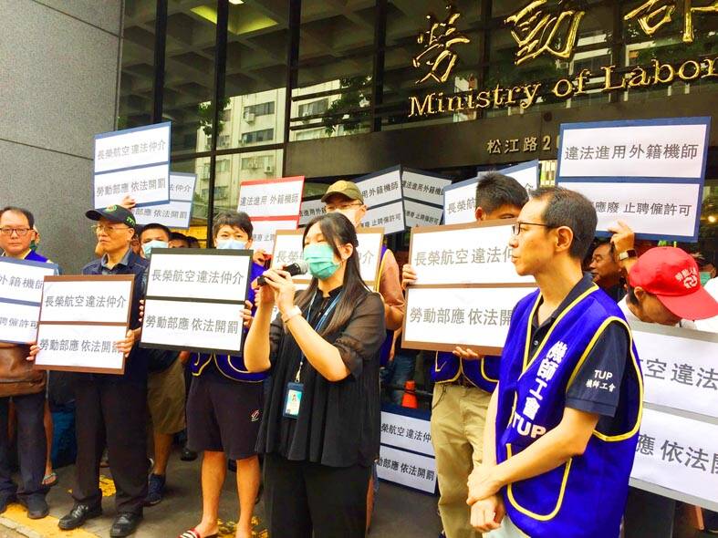 Union members protested in front of the Ministry of Labor headquarters in Taipei in the morning after saying they have substantial evidence showing that the nation’s two large airlines have hired pilots who do not have licenses to operate some aircraft in their fleets.
