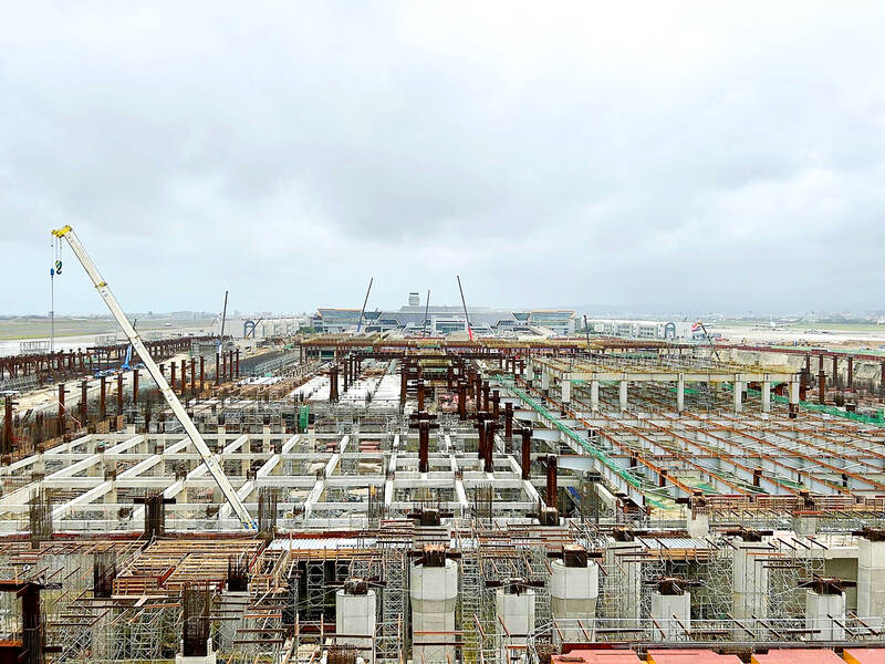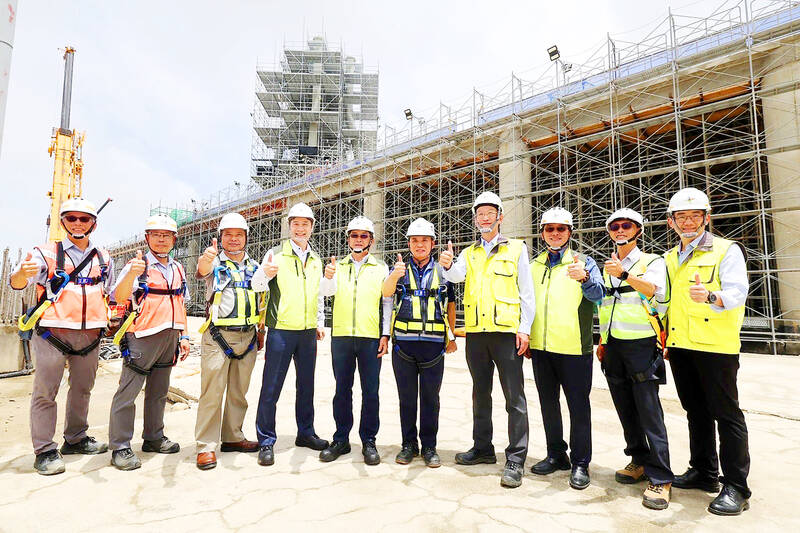 Construction of Taiwan Taoyuan International Airport’s Terminal 3 continues, and yesterday, Taoyuan International Airport Corp (TIAC) chairman Yang Wei-fuu and chief executive officer Fan Hsiao-lun visited the main terminal construction site to inspect the assembly of the first giant roof structure column and to encourage the hardworking construction team.