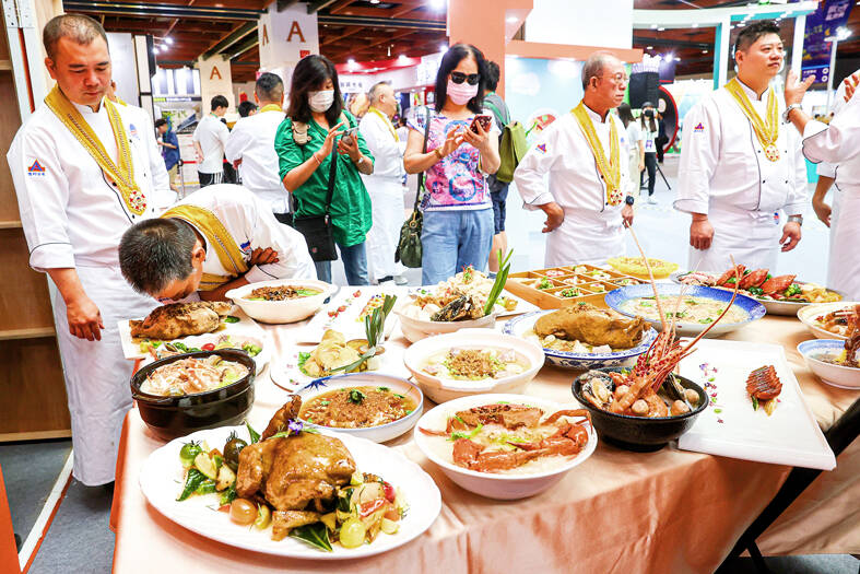 The exhibition is organized into four sections: the “Golden Selection Area” showcasing award-winning cuisine, the “Taste of Taiwan Area” introducing the culinary landscape of Taiwan, the “Exotic Cuisine Area” featuring delicacies from Japan, South Korea and Nigeria, and the “Food Art Gallery,” the event’s Web site said.
