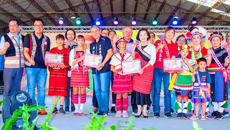 Yilan County Commissioner Lin Zi-miao, seventh left, and guests yesterday display picture books published by the county government featuring six indigenous languages: Squliq Ataya, Skikun Atayal, Kena Coli Klesan Tayal, Siwkolan Amis, Pasawalian Pangcah and Kari Truku.