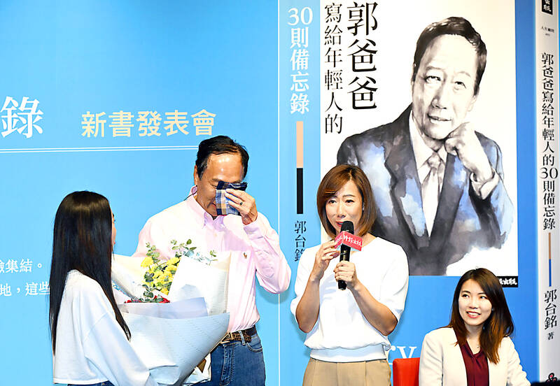 Hon Hai Precision Industry Co founder Terry Gou wipes away tears after he received a Father’s Day bouquet from his daughters, Shirley Kuo, second right, and Kuo Hsiao-ju, left, during an event in Taipei yesterday announcing his new book “30 Memos Written by Father Guo to Young People.”