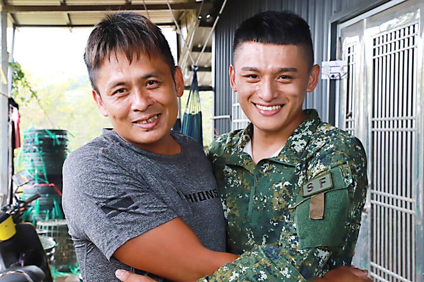 A soldier in Nantou County hiked through landslides and flooding to bring supplies to his parents who had been sheltering at a mountain hut since Typhoon Khanun closed roads in the area.