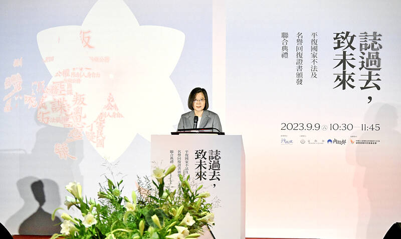 President Tsai Ing-wen (蔡英文) yesterday presented certificates to restore the reputation of victims of the state during the nation’s authoritarian period.