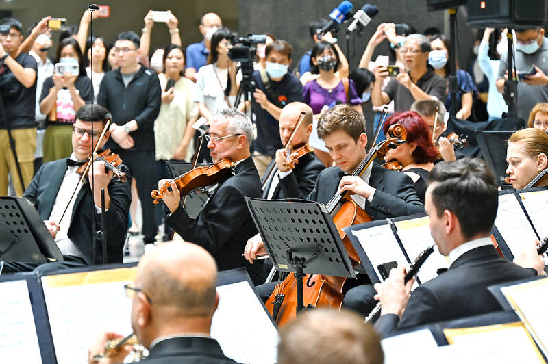 The National Symphony Orchestra of Ukraine performs Ukraine’s national anthem and a classic Hoklo (commonly known as Taiwanese) song, “Longing for the Spring Breeze,” at the Kaohsiung City Government’s Siwei Administration Center yesterday morning. The orchestra, who arrived on Saturday for their first performance in Taiwan, performed a concert at the National Taichung Theater last night. It is to perform a concert at the National Kaohsiung Center for the Arts (Weiwuying) in Kaohsiung today and at the National Concert Hall in Taipei tomorrow.