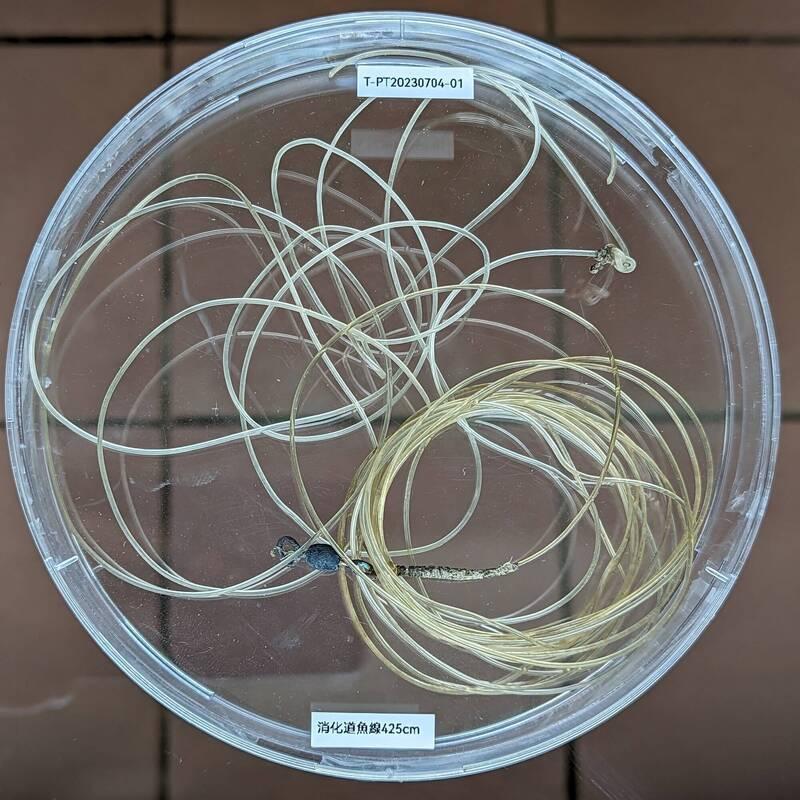 An X-ray then revealed two fishing lines totaling 425cm in length that had apparently been there for some time, extending from the stomach to the large intestine, it said.