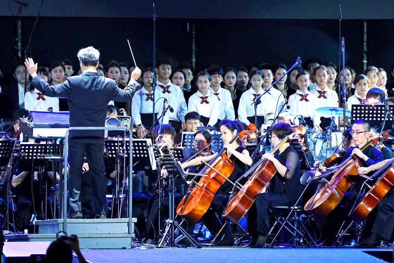 The Kaohsiung City Symphony Orchestra yesterday performs at the plaza outside Taipei’s National Theater and Concert Hall in a concert cohosted by the Ministry of Culture and the General Association of Chinese Culture. The concert takes the audience down memory lane with movie theme scores from the past century. There is to be another performance today at 6pm and admission is free.