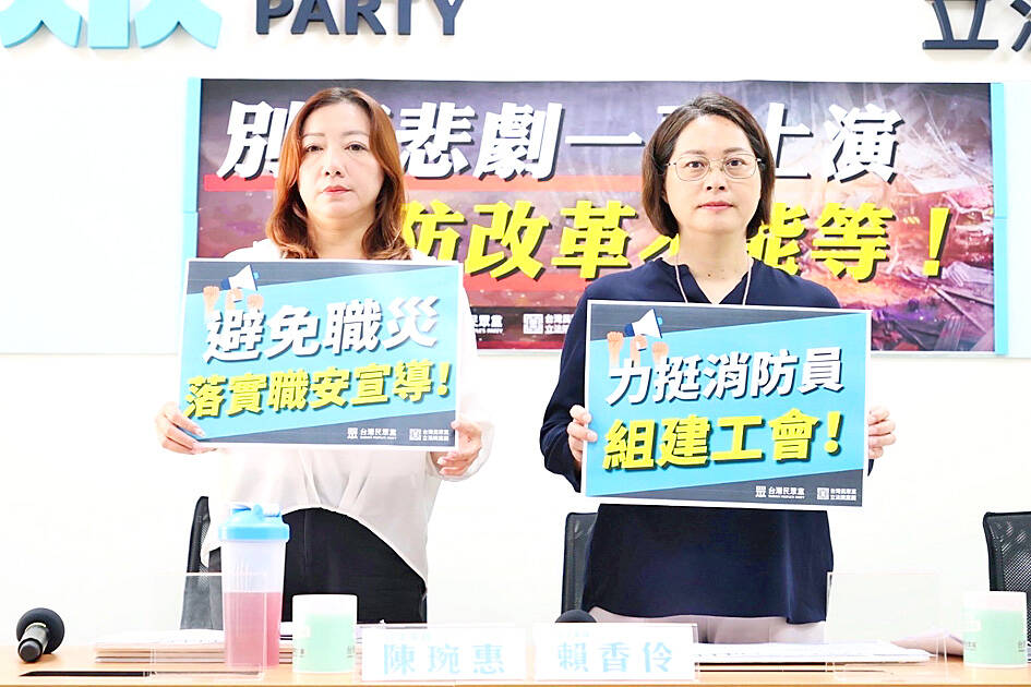 The government should permit firefighters to organize unions, and allot more funding to procure new equipment such as tools and robots, Taiwan People’s Party (TPP) legislators said yesterday.