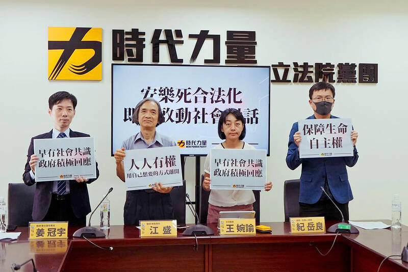 “Facing all the controversies, our responsibility as legislators is to initiate genuine dialogue on the issue in society, which should seek to break past taboos and reach a consensus. Legislation should be stipulated to guarantee everyone’s autonomy over their own lives,” NPP Chairwoman Claire Wang (王婉諭) told a news conference in Taipei.
