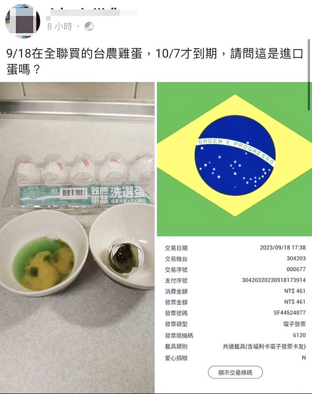 Hsieh wrote in Mandarin: “On Sept. 18 I bought these Tai Nong eggs from Pxmart, and their expiration date is Oct. 7. May I ask, were these eggs imported?”