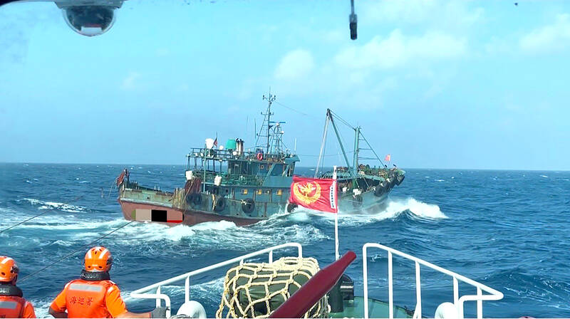 The coast guard yesterday boarded a Chinese fishing boat and detained 17 crew for allegedly illegally harvesting fish and ramming a patrol vessel, the Hsinchu-based Flotilla 12 of the Coast Guard Administration said yesterday.