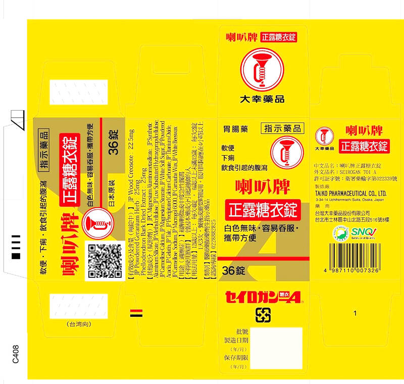 The Seirogan Toi-A tablets are imported by Taiwan Taiko Pharmaceutical Co Ltd, and are used for the treatment of mild or moderate acute diarrhea and abnormal movement of the intestinal tract. They include three main APIs, including dried phellodendron bark extract.