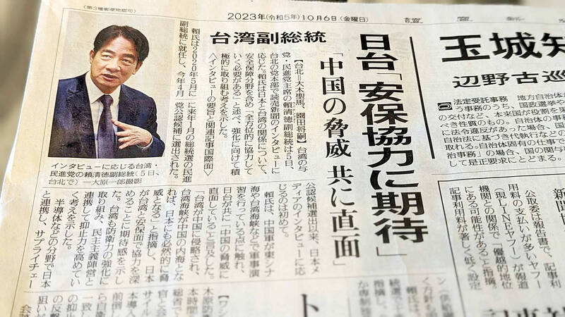 Taiwan and Japan should “work together in every possible way” as they are on the front line of “Chinese threats,” Lai said.