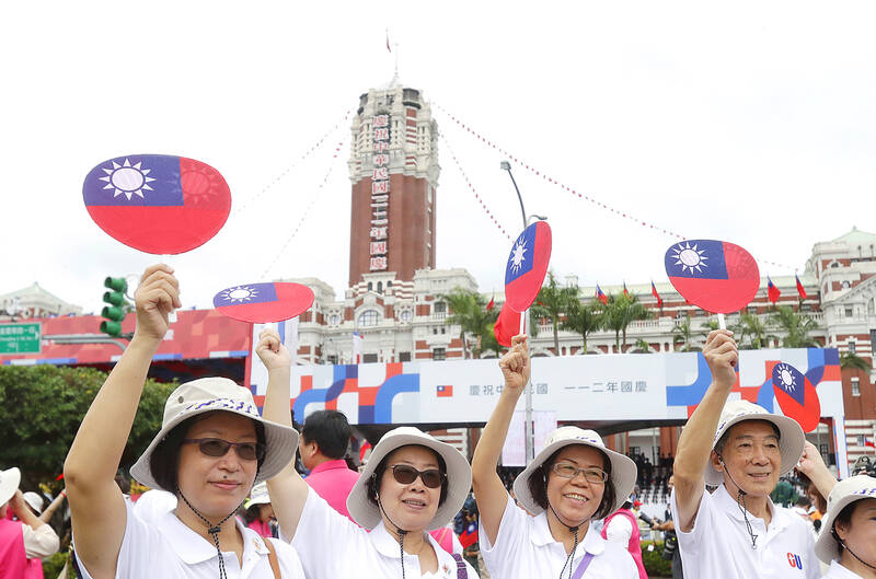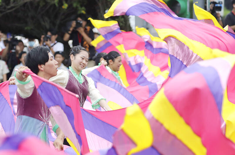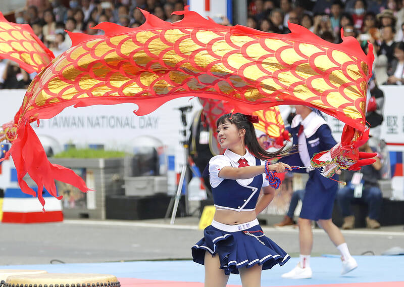 More than a dozen groups yesterday morning performed as part of the Double Ten National Day ceremony in front the Presidential Office Building in Taipei, including dancers, drummers and marching bands from the US and Japan.