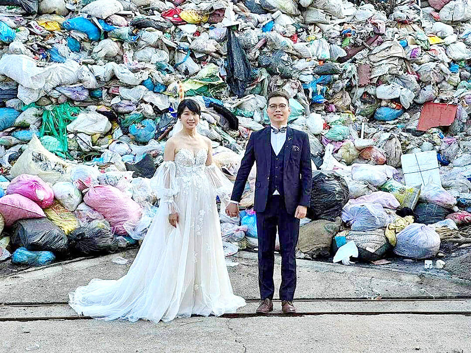 A Nantou County couple on Saturday took their wedding photographs in front of a “garbage mountain” to raise awareness of waste management problems in the mountainous central county.