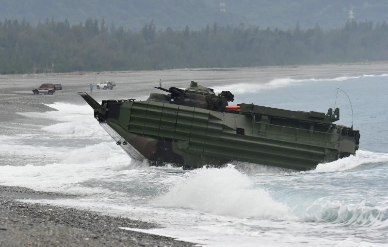 Boundary markers were set up along the beach to guide three Assault Amphibious Vehicles (AAV-7) and 36 combat assault vehicles landing from a Chung Ho-class tank landing ship in three waves starting from 8am.