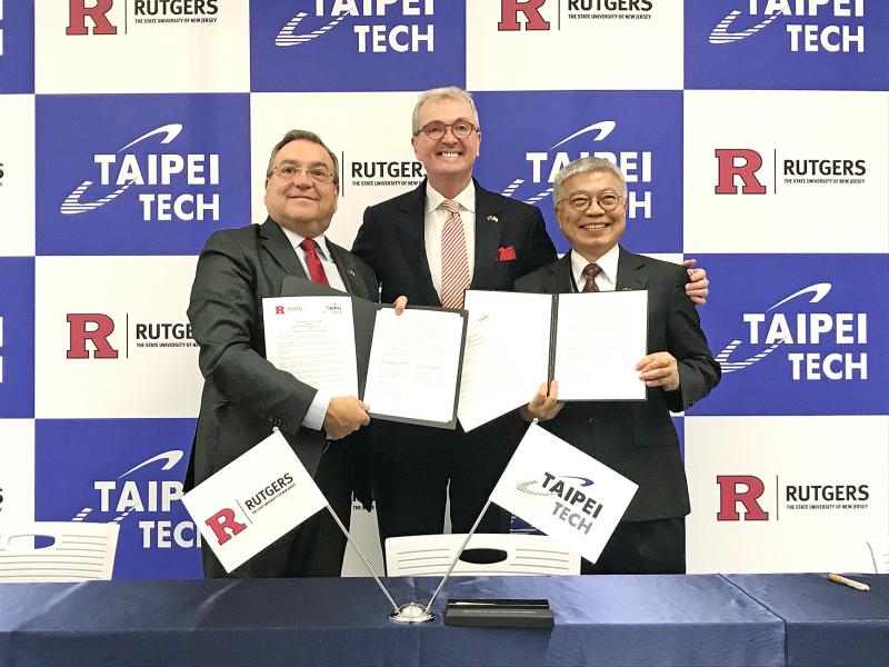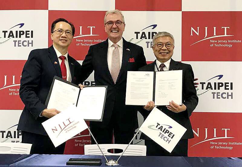 New Jersey Governor Phil Murphy yesterday led a delegation to visit Taipei and witness the signing of a memorandum of understanding between National Taipei University of Technology (Taipei Tech), Rutgers University, and New Jersey Institute of Technology (NJIT).