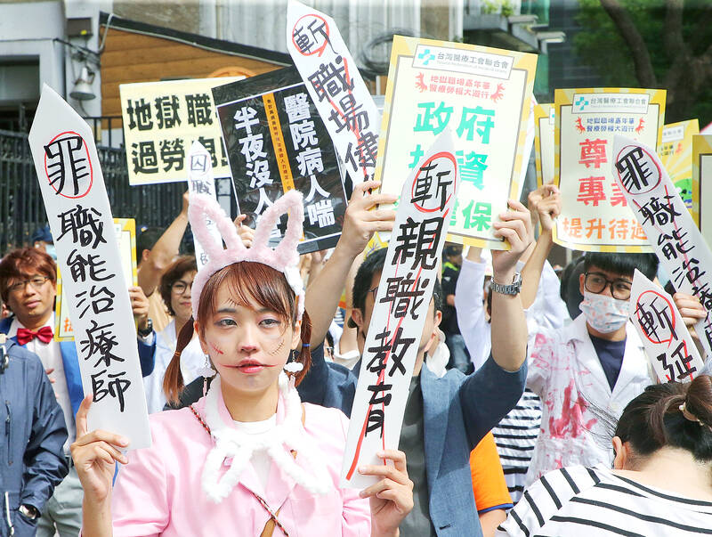 The Taiwan Federation of Medical Unions (TFMU) yesterday held a rally in front of the Legislative Yuan and a short parade, urging the government to improve healthcare workers’ labor conditions by accepting its four main demands.