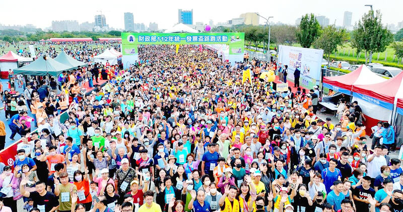 Runners in the annual Uniform Invoice Lottery Cup hosted by the Ministry of Finance set off from Taichung’s Central Park yesterday morning. The ministry said that 18,000 people took part in the event, at which an estimated 720,000 invoices were collected to be donated to charity.