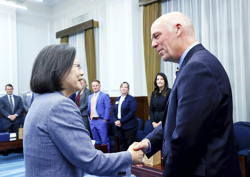 Taiwan and Montana can both benefit from deeper partnerships in key industries, President Tsai Ing-wen (蔡英文) yesterday told Montana Governor Greg Gianforte, who expressed optimism regarding cooperation between his state and Taiwan.