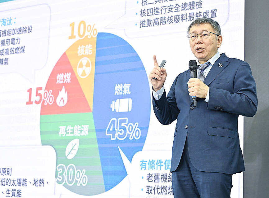 Taiwan People’s Party (TPP) presidential candidate Ko Wen-je (柯文哲) on Wednesday presented his energy policy, calling for a transition to sustainable energy and extending the lifetime of two nuclear power plants.