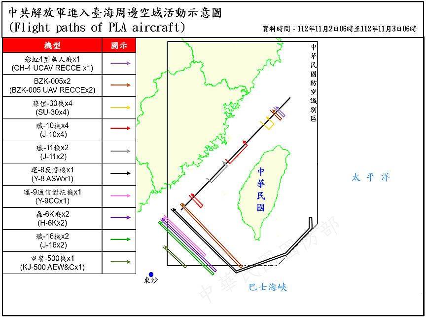The aircraft include one CH-4 reconnaissance drone, two Harbin BZK-005 high-altitude long-range drones, four Sukhoi Su-30 fighter jets, four Chengdu J-10 fighters, two Shenyang J-11 fighters, one Shaanxi Y-8 transport aircraft, one Shaanxi Y-9 transport aircraft, two Xian H-6 bombers, two Shenyang J-16 fighters and one Shaanxi KJ-500 airborne early warning and control aircraft, it said.