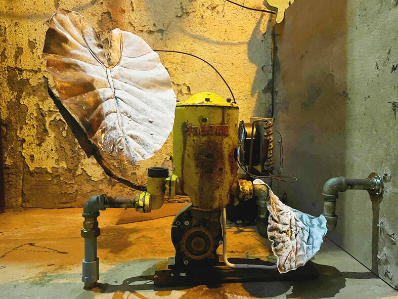 Chen’s work recreates a shed used for his artwork, in which two metal giant leaves of a night-scented lily plant are connected to a modified compressor and frosted.