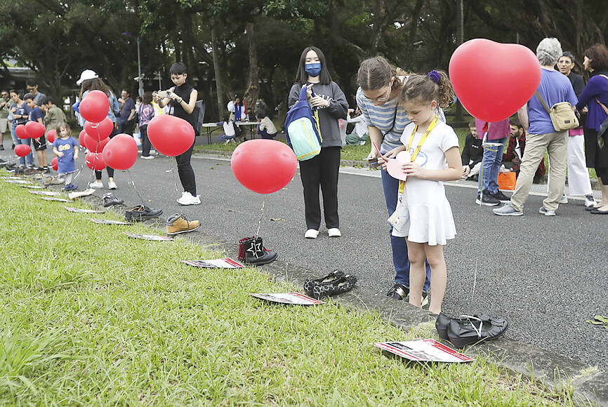 A group of advocates yesterday staged an installation art exhibition in Taipei’s 228 Peace Memorial Park to raise awareness of the more than 200 hostages taken during Hamas’ Oct. 7 attack on Israel.