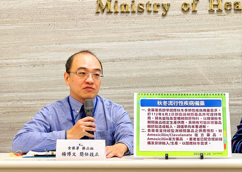 FDA Medicinal Product Division head Yang Bo-wen (楊博文) said in preparation for a likely increase in infections due to Taiwan lifting its COVID-19 restrictions earlier this year and because many respiratory infectious diseases peak in autumn and winter, the FDA on Aug. 2 told drugmakers with permits for antibiotics, drugs for treating respiratory illnesses and gastrointestinal tract infections, antipyretics, and analgesics to ensure a stable supply of the products.