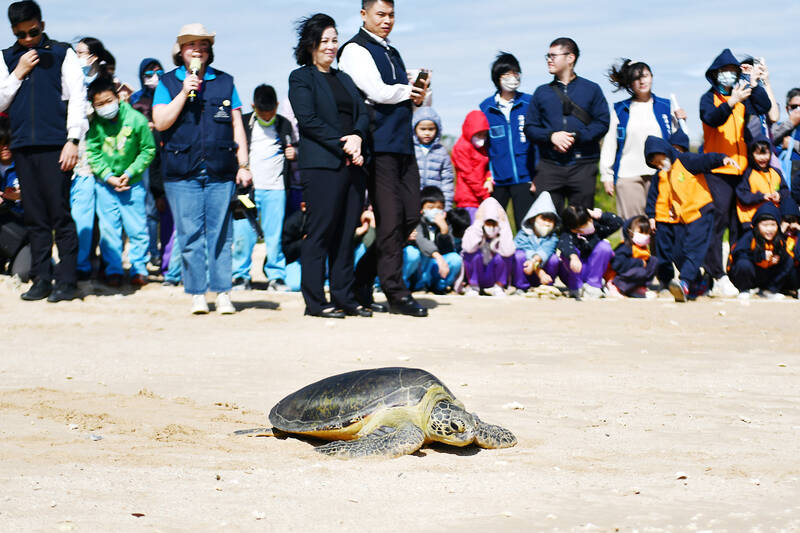 A sea turtle rehabilitated by the Ocean Conservation Administration moves off the Houbihu beach on its way to the sea as people watch in Pingtung County’s Kenting area yesterday. The agency’s Marine Animal Rescue Network has a comprehensive mechanism to conserve, rehabilitate and research protected wildlife.