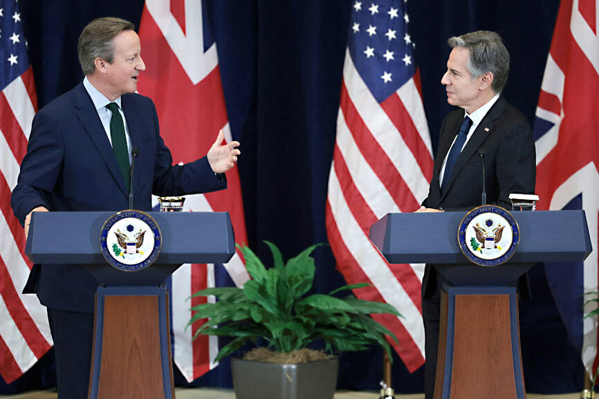 The US and the UK are aligned on key challenges they face in the Indo-Pacific region, including “ensuring peace and stability across the Taiwan Strait,” Blinken told a news conference after he met with Cameron in Washington.