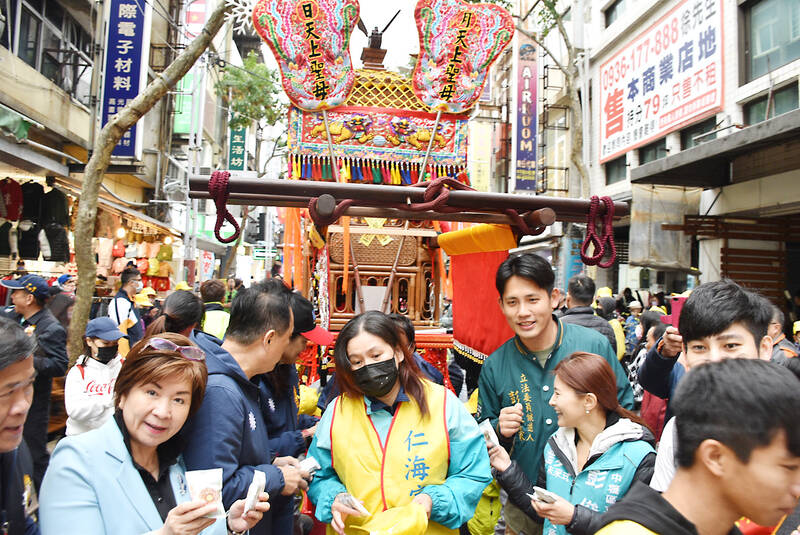 A procession of the sea goddess Matsu held by the Jhongli Renhai Temple through the Zhongping Commercial District in Taoyuan yesterday is joined by Chinese Nationalist Party (KMT) legislative candidate Lu Ming-che, third left, and Democratic Progressive Party legislative candidate Peng Chun-hao, fifth left.
