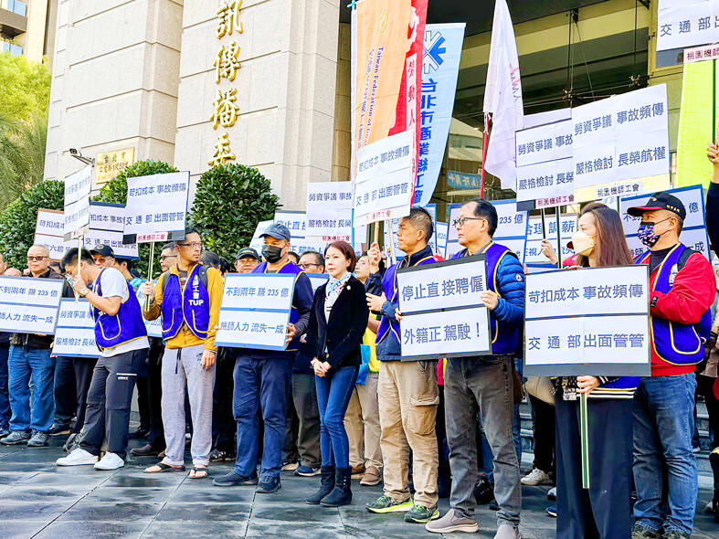 The union, made up of pilots from China Airlines, EVA and other Taiwanese airlines, yesterday protested outside the Ministry of Transportation and Communications in Taipei, accusing EVA of compromising aviation safety by cutting personnel costs.