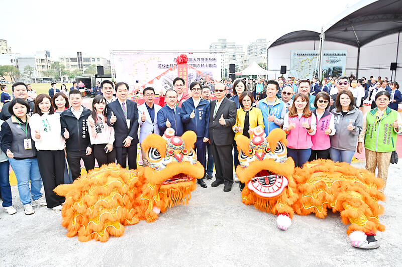 Kaohsiung Mayor Chen Chi-mai, front row, center left, and Kaohsiung City Council Speaker Kang Yu-cheng, front row, fifth right, pose with other councilors at a groundbreaking ceremony for the planned Kaohsiung Mass Rapid Transit yellow line in Fongshan District yesterday.