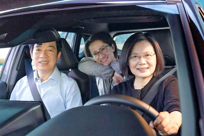 From left, Democratic Progressive Party (DPP) presidential candidate Vice President William Lai, vice presidential candidate Hsiao Bi-khim and President Tsai Ing-wen appear in the DPP’s new election campaign video released on Tuesday night. The video depicts Tsai driving a car and later handing the keys to Lai, symbolizing handing the government and Taiwan’s future to him to continue leading the nation along the road of freedom and democracy.