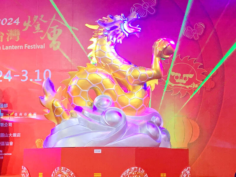 The 22m-high main lantern, named Dragon Comes to Taiwan (龍來台灣), features a golden dragon made of carbon 60 and recycled ethylene-vinyl acetate (EVA) film, the administration said.