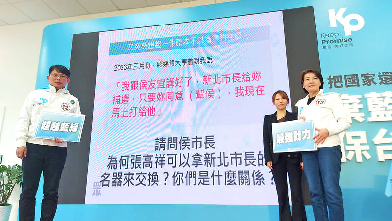 She also said that property developer Chang Kao-hsiang (張高祥), the owner of EBC News, had in March last year offered her three options — to become Hou’s running mate, run in the New Taipei City mayoral by-election if Hou steps down or become a minister.