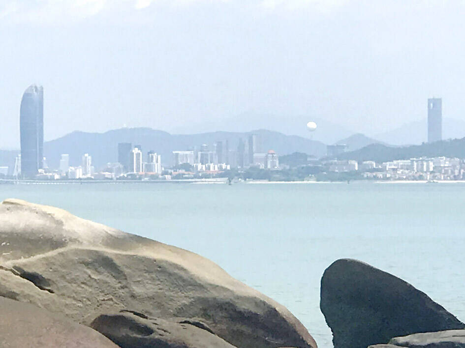 From Kinmen’s northern coast, cranes constructing a massive airport to serve Xiamen are visible. The most likely bridge route would connect Kinmen to Xiamen via this airport, Deputy Kinmen Mayor Li Wen-liang (李文良) said.
