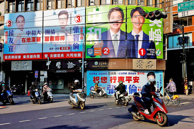 People ride past campaign ads for the Democratic Progressive Party’s (DPP) presidential candidate, Vice President William Lai, DPP legislator-at-large candidate Justin Wu, the Chinese Nationalist Party’s (KMT) presidential candidate, New Taipei City Mayor Hou You-yi, and KMT legislator-at-large candidate Chang Chih-lun in Taipei yesterday.