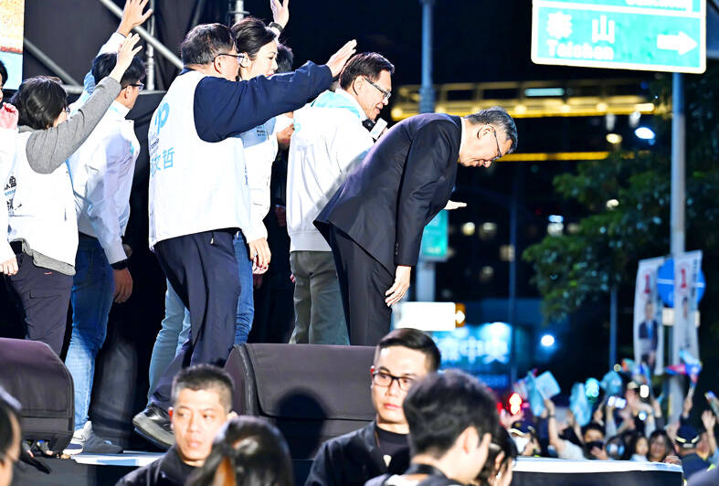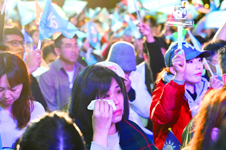 Ko and his running mate, TPP Legislator Cynthia Wu (吳欣盈), arrived at a post-election rally in front of his national campaign headquarters in New Taipei City’s Sinjhuang District (新莊) at about 8pm and were greeted by supporters passionately waving flags and calling his name.