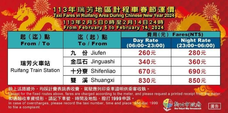 Meanwhile, taxis to Wulai (烏來) and Rueifang (瑞芳) districts during the holiday period are to travel along set routes with fixed pricing, the department said.